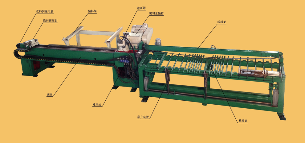 1、送料伺服電機 2、送料液壓鉗 3、儲料架 4、床身 5、液壓站 6、液壓鉗 7、鋸切主軸箱 8、轉(zhuǎn)料家 9、舉升裝置 10、整料架 11、電控箱